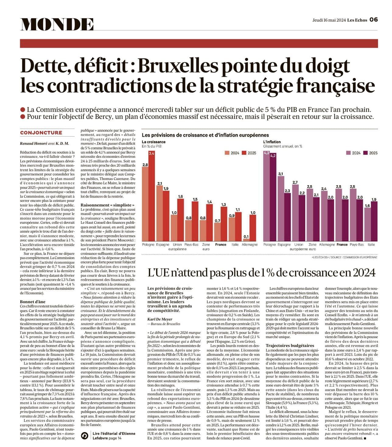 ❗️L’heure des comptes se rapproche donc, mais elle n’a pas encore sonné. Afin de ne pas interférer dans la campagne des élections européennes, la Commission a en effet renvoyé à plus tard ses recommandations. Le calendrier est déjà néanmoins bien balisé : après le verdict de Standard & Poor’s sur la dette française à la fin du mois, la France devrait être mise sous procédure de déficit excessif par la Commission mi-juin, et un bras de fer commencera à l’été sur le budget 2025 et la trajectoire de retour sous les 3 % de déficit d’ici à 2027.